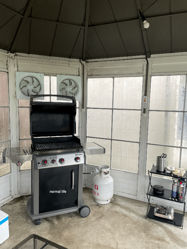 실외에 캠핑장 분위기로 꾸며진 바베큐존이다. 비 오는 날에도 날씨 걱정 없이 바베큐를 즐길 수 있고 숯직화구이가 아닌 가스를 이용하는 바베큐장으로로 숯보다 편리하다고 남편이 좋아했던 공간이다. 바베뷰 추가 금액은 3만원이다.