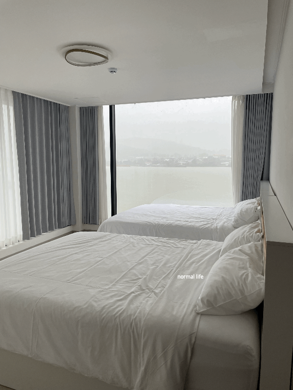 침대 앞 두면이 모두 통창으로 폭신한 침대 위에서 호수뷰를 즐길 수 있었다. 호수 위에 떠있는 낚시터가 너무도 궁금한 5세 꼬마친구들이다.