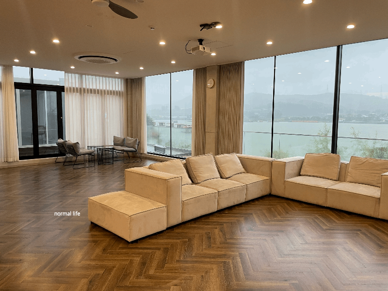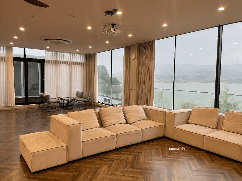 1층 탁 트인 호수뷰와 우드 앤 베이지의 따뜻한 분위기 가득한 스테이 인 웜아이스 거실이다.