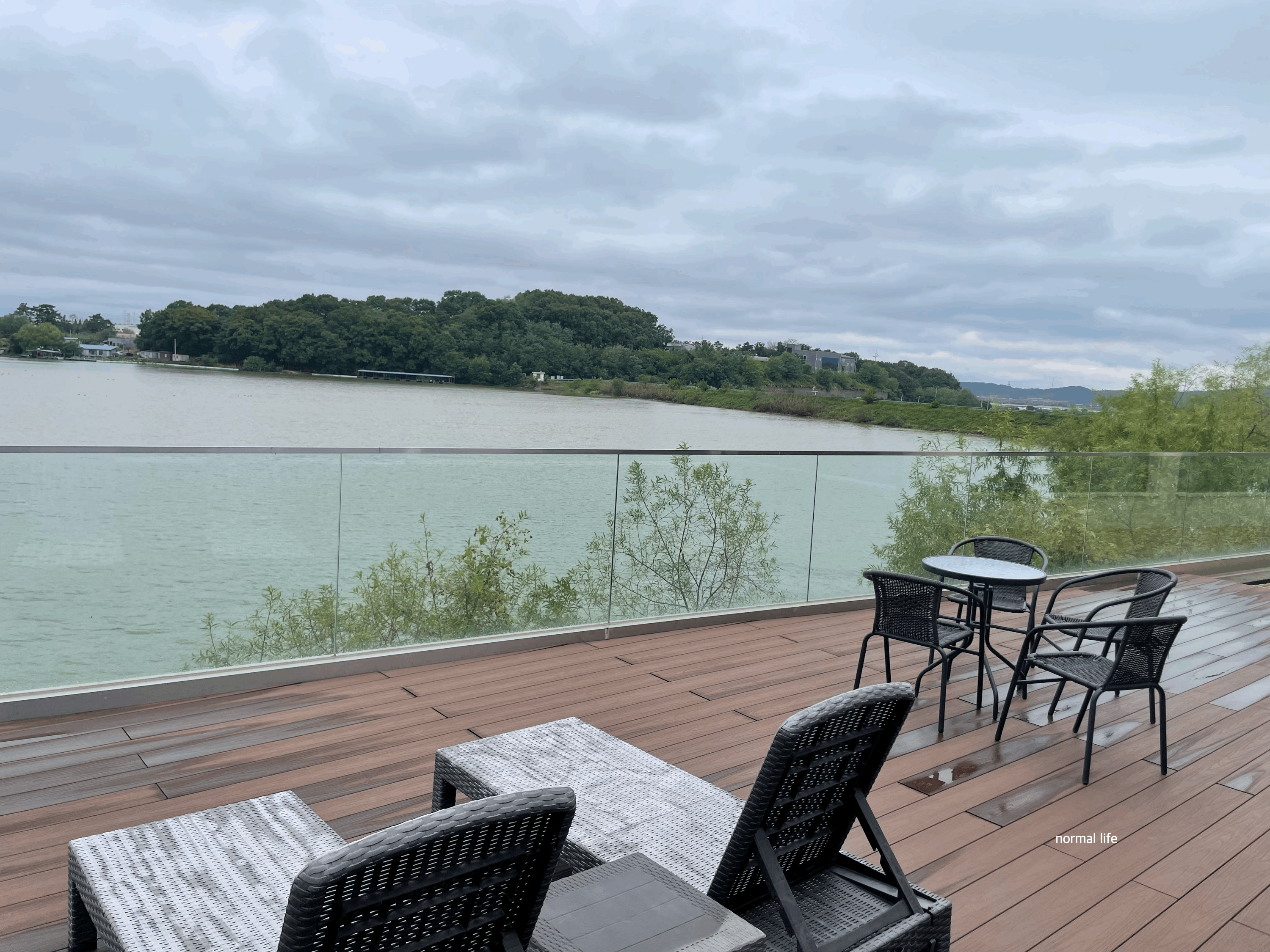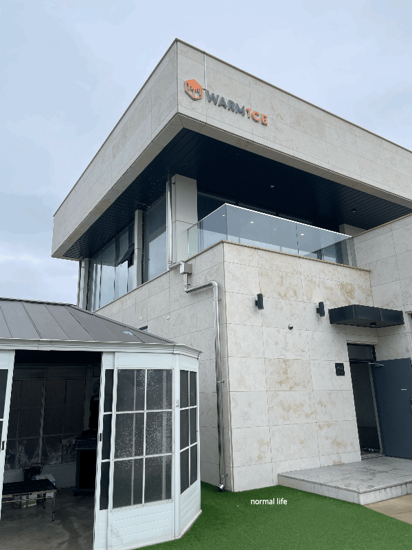 스테이 인 웜아이스 1층 거실에서 밖으로 나가 온수풀을 이용해야 하는데 그곳에 야외테라스도 있다. 우리가 방문했던 날에는 비가 와서 테라스를 이용하지 못해 조금 아쉬웠다.