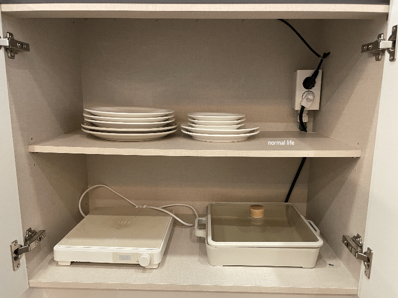 냄비, 프라이팬, 인덕션용 고기불판, 전골냄비, 야채탈수기, 주류용 컵, 그릇, 접시, 어린이 식기와, 조리도구와 집기, 커트러리까지 뭐 하나 부족함이 없었던 스테이 인 웜아이스의 부엌이다.
