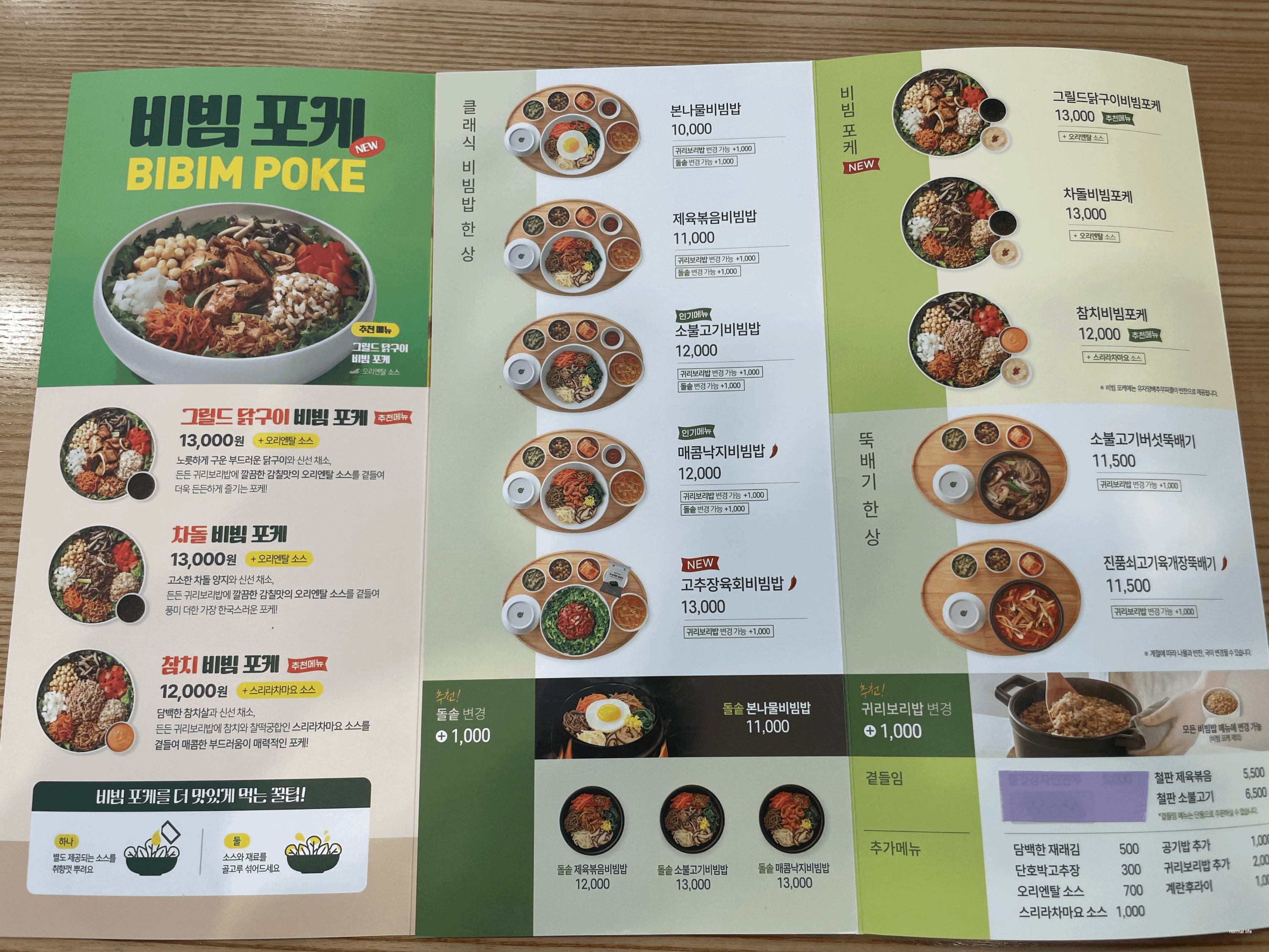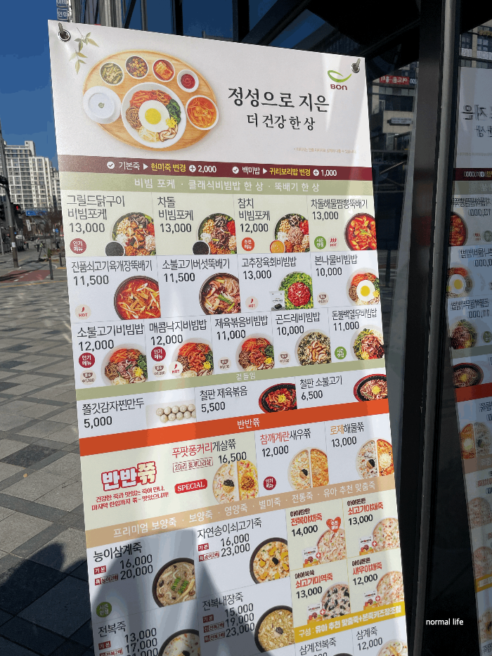 가온마을 5단지에서 케이티온 S타워로 이전하면서 죽전문점에서 본죽&비빔밥을 함께 즐길 수 있는 매장으로 재오픈하였다. 덕분에 점심시간 뭉근히 끓여내 부드러운 죽과 신선한 나물이 올려간 건강한 비빔밥을 즐기는 손님들이 매장을 채웠다. 클래식한 본나물비빔밥 10,000원 인기메뉴인 소불고기비빔밥 12,000원 매콤낙지비빔밥 12,000원이다. 1,000원을 추가하면 돌솥으로 변경이 가능해 식사 내내 따뜻하게 비빔밥을 즐길 수 있다.