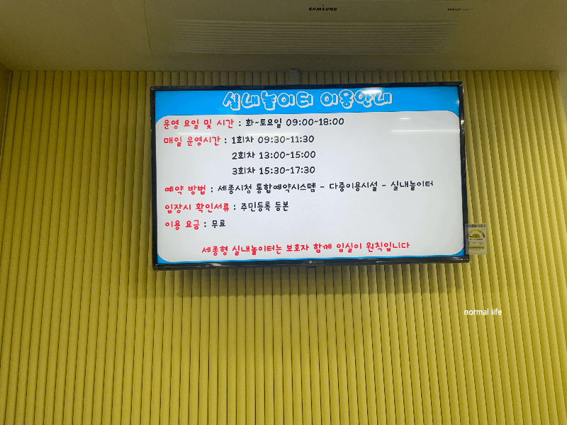 CGV 세종 옆 종촌종합복지센터 2층에 위치한 세종형 실내놀이터 1호이다. 지하주차장이 있으나 주차공간이 많지 않아 주차하기 쉽지 않았다. 몇 번을 주차장을 돌다가 겨우 주차를 하고 입장 시간에 맞출 수 있었다. 입장시간 30분 후부터는 현장대기자에게 넘어가니 미리 도착하여 여유 있게 주차하기를 추천한다.