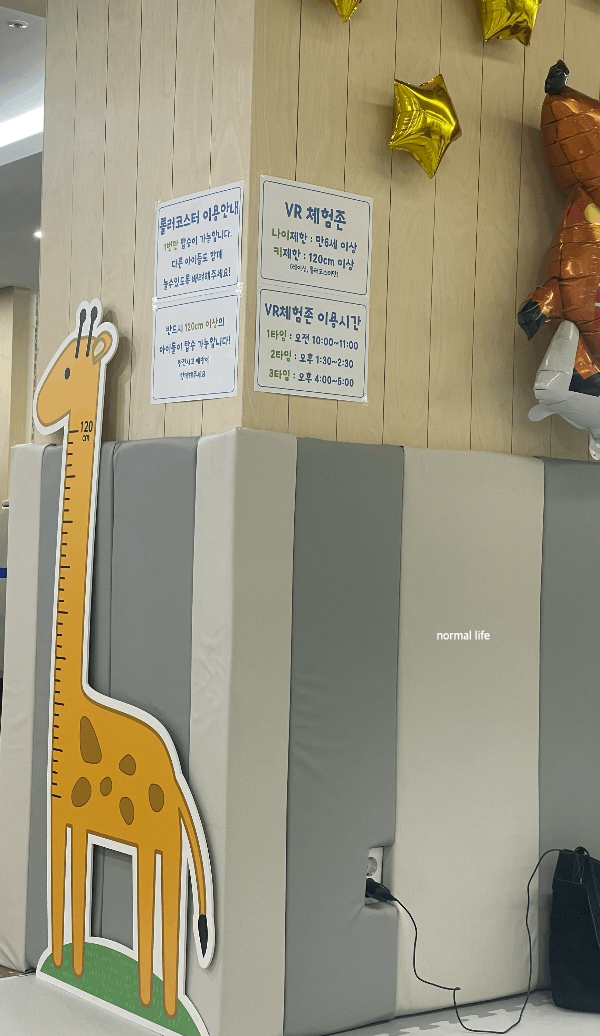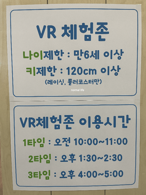 VR체험은 만 6세부터 이용이 가능하고 레이싱과 롤러코스터는 키 120cm이상만 체험 가능하다.