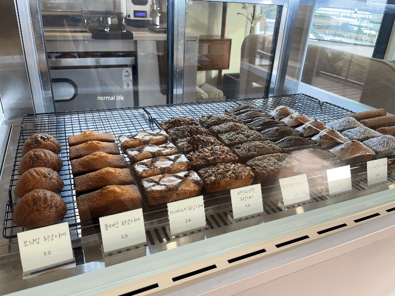 드로와 유 매장에서 직접 만들고 있는 다양한 휘낭시에가 쇼케이스에 가지런히 진열되어 있다. #보늬밤 휘낭시에 3,000원 #플레인 휘낭시에 2,500원 #누네띠네 휘낭시에 2,800원 #피칸캬라멜 휘낭시에 3,000원 #쑥크럼블 휘낭시에 3,000원 #더블초코 휘낭시에 3,200원 #얼그레이 휘낭시에 2,800원이다.