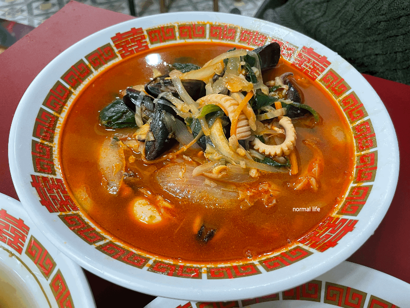 장순루에는 짬뽕과 고추짬뽕이 있는데 대표메뉴는 고추짬뽕이다. 매운 음식을 잘 못 먹는 나는 일반짬뽕을 주문하였는데 오징어, 홍합, 주꾸미와 각종 야채가 들어가 깔끔하고 적당히 얼큰해 맵찔이인 내 입맛에 딱인 짬뽕이었다. 청양고추와 홍고추가 들어가 매콤함이 매력적인 고추짬뽕은 장순루의 시그니처이니 매운맛을 좋아하는 사람이라면 꼭 한번 맛보길 추천하고 싶다.