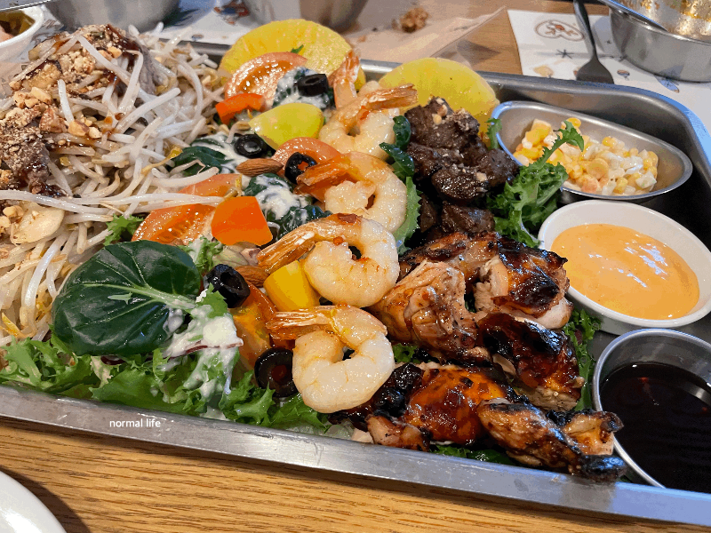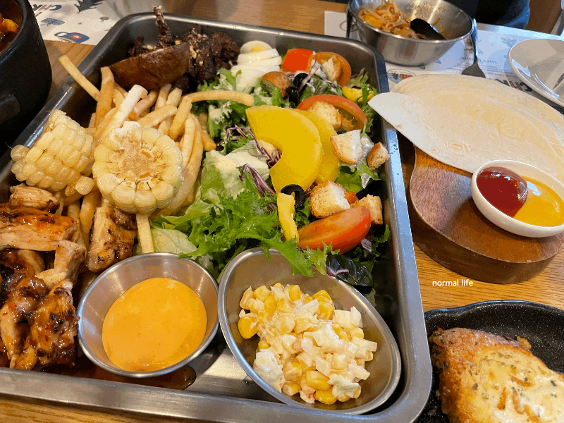 갈비소스에 재워 오븐에 구운 토시살, 닭다리살 BBQ치킨, 신선한 계절야채, 감자튀김, 또르띠아가 함께 제공되는 꽃등심 플레이트이다. 다양한 메뉴를 풍성하게 즐길 수 있어 가족과 모임에 적합한 수페세트 5인이다.