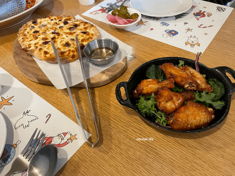 미니사이즈의 고르곤졸라피자가 두툼한 도우 위에 치즈와 크렌베리 아몬드가 심플하게 토핑이 되어있어 아이와 함께 맛보기에 좋았다. 식사동안 따뜻하게 맛볼 수 있도록 무죄팬에 윙&봉 5조각이 야채와 함께 제공된다.