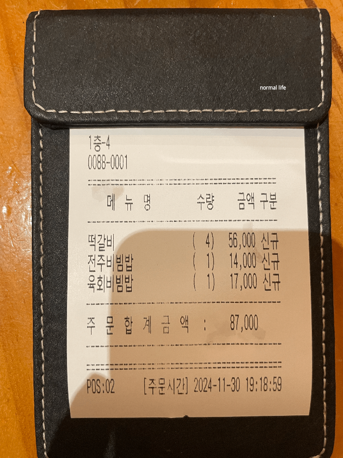우리는 성인 4명 어린이 3명이 주말 저녁시간 때 방문하여 떡갈비 4인과 전주비빔밥, 육회비빔밥을 주문하였다.
