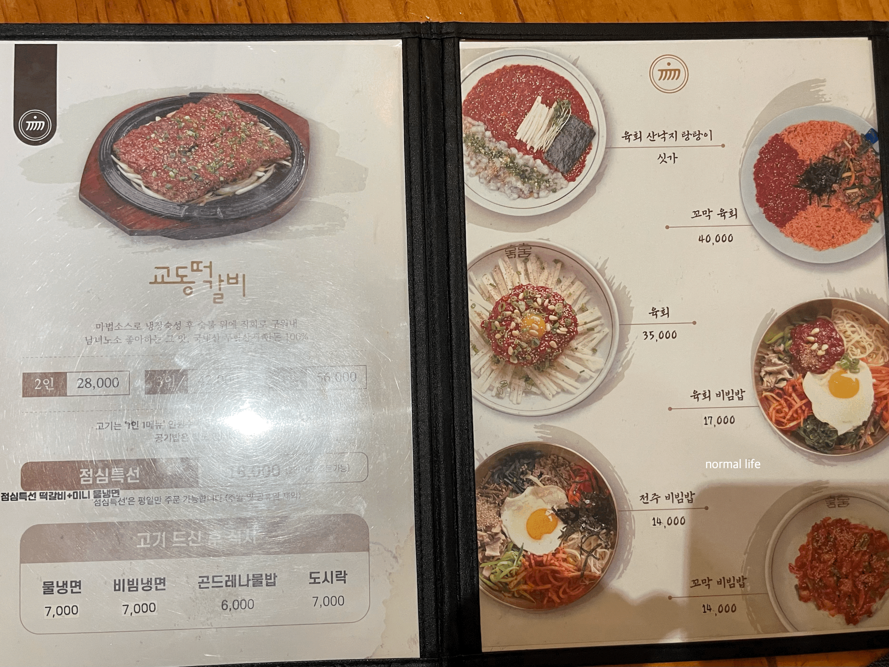 국내산 무항생제 한돈 100%로 만들어진 교통떡갈비는 #2인 28,000원 #3인 42,000원 #4인 56,000원이다. 평일 점심특선으로 떡갈비와 미니 물냉면, 공깃밥, 된장국을 16,000원에 맛볼 수 있다. 전주에서 맛보는 #전주비빔밥 14,000원 #육회비빔밥 17,000원 #육회 35,000원 #꼬막비빔밥 14,000원 #육회산낙지탕탕이 시가 등 다양한 메뉴를 선택할 수 있다.