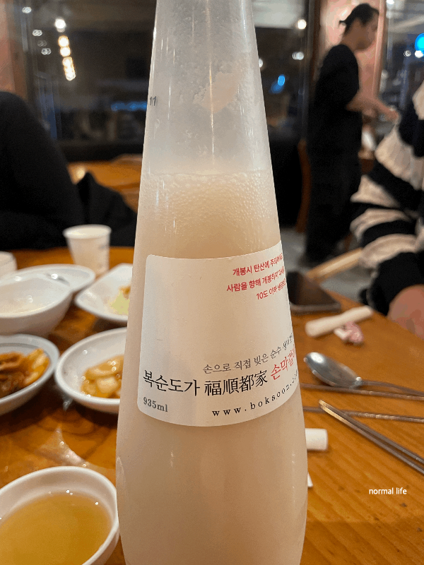 전주한옥마을과 잘 어울리는 막걸리를 맛보기 위해 복순도가를 주문하여 식전주로 마셨다. 탄산이 강해 개봉 시 주의해야 하는데 직원분께서 직접 개봉해 주셔서 편하게 마실 수 있었다. 산미와 깔끔한 맛이 떡갈비와도 잘 어울리는 전통주이다.