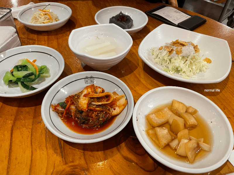 얼갈이나물, 겉절이, 양파장아찌, 동치미, 콩나물무침, 메밀묵, 양배추 샐러드 된장국의 정갈한 전라도식 밑반찬이 나온다.
