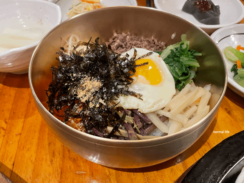 당근볶음, 고사리, 도라지나물, 얼갈이나물, 콩나물, 계란프라이, 그리고 신선한 육회무침이 올라간 육회비빔밥이다. 놋그릇에 재료의 색감을 살린 나물과 신선한 육회무침을 올려 눈으로 영양과 맛을 한 번에 즐길 수 있는 육회비빔밥이다.
