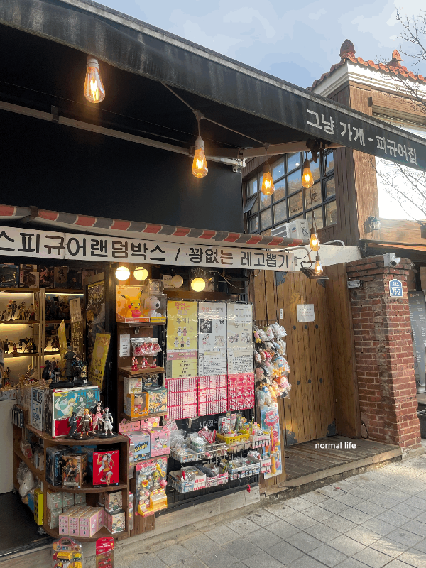 전주한옥마을을 내려 골목골목을 산책하며 경기전을 향하던 중 사람들로 가득한 가게에 발길을 멈추었다. 5세 딸아이와 여행할 때 장난감 쇼핑이 필수인데 어린아이와 어른 모두 좋아하는 것들로 가득한 그냥 가게- 피규어집이다.