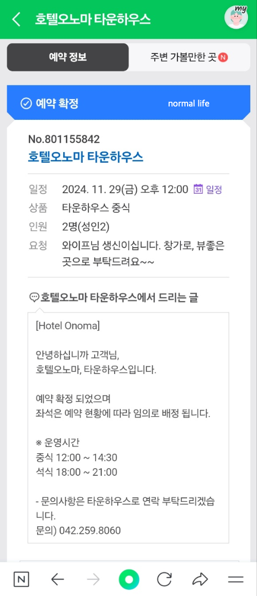 호텔 오노마 타운하우스는 네이버 예약과 전화 예약이 가능하다. 11월 생일을 맞이해 남편이 간편한 네이버 예약을 통해 사전예약을 하였다. 갑천과 대전 시내가 바라보이는 창가뷰를 사전에 요청하여 창가좌석에서 식사를 할 수 있었다.