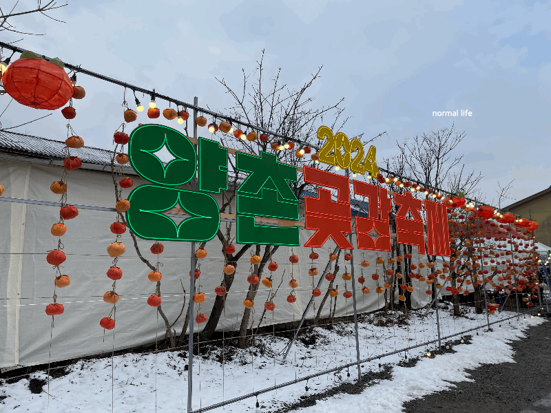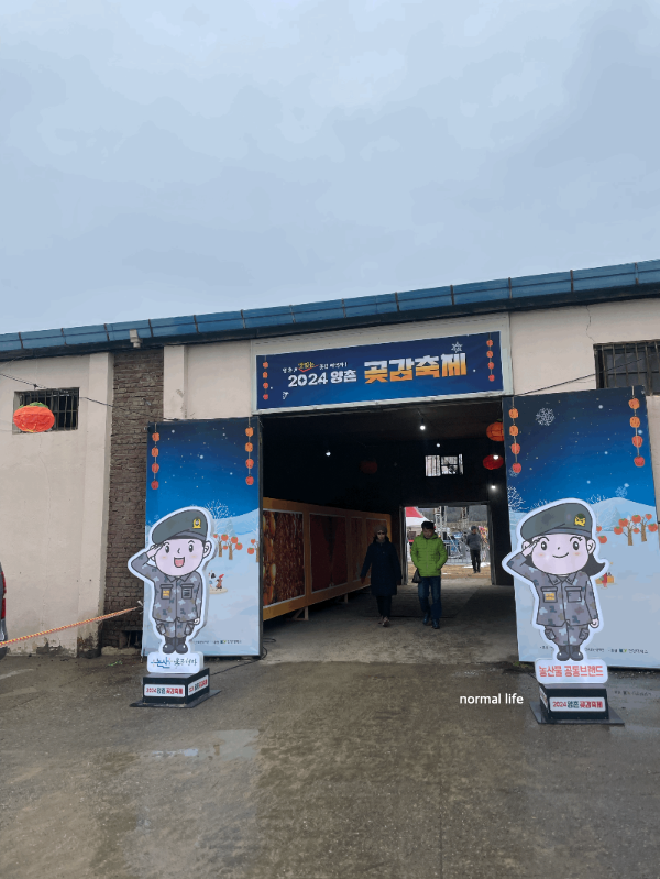 양촌곶감축제의 마지막날인 15일 아침에는 눈이 많이 내리고 온도도 낮았다. 오후에는 눈이 녹아 땅이 질퍽해 평소 정비된 도로가 익숙한 나에게는 조금 많이 불편했다. 감부스와 체험부스, 무대 쪽으로 멍석을 깔아 두어 불편함을 해소할 수 있어 그나마 다행이었다.