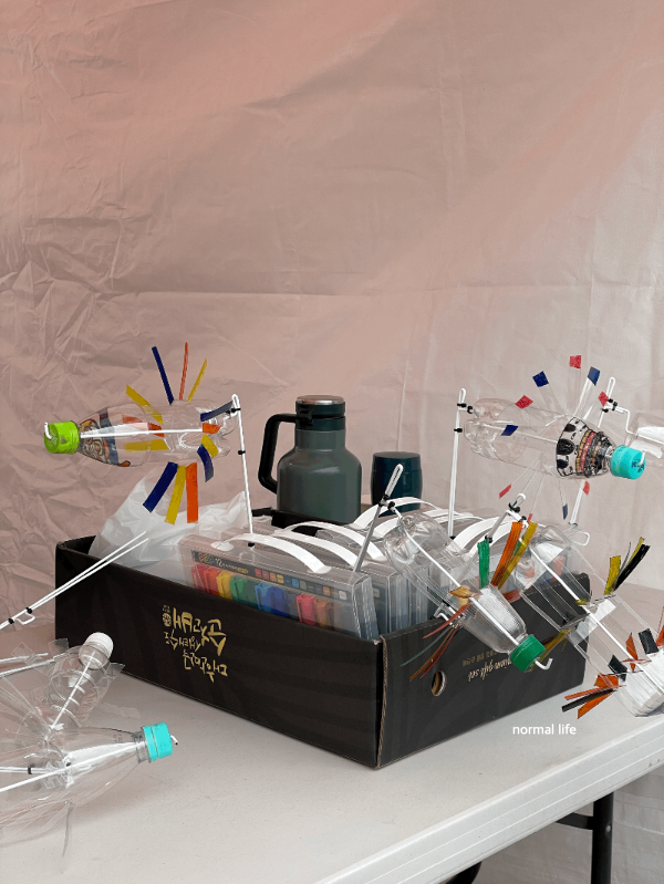 2024년 양촌곶감축제 안내부스 옆에는 재활용 플라스틱 용기와 옷걸이를 이용한 바람개비 체험공간이 마련되어 있었다. 어린이는 무료로 체험이 가능해 사인펜으로 원하는 알록달록한 바람개비를 만들 수 있다.