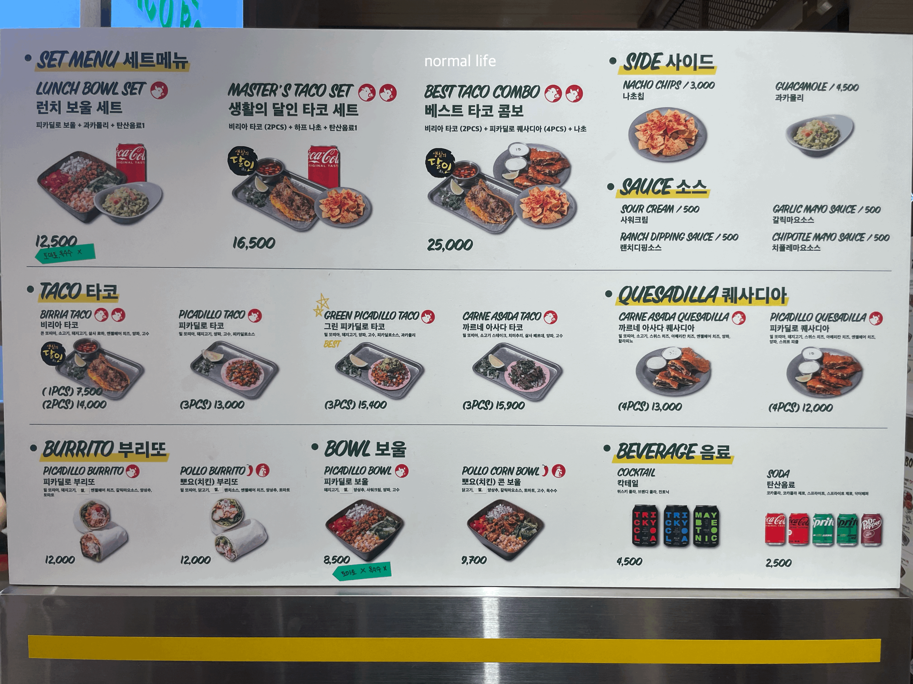 생활에 달인에 소개돼 타코 달인으로 인정받은 비리아 타코 2 PCS를 주문하였다. 옥수수 또르띠아에 소고기, 돼지고기, 살사로하, 엔젤헤어치즈, 양파, 고수가 들어간 푸짐한 비주얼이다. 부드러운 또르띠아와 육즙 가득한 고기, 진한 치즈와 멕시코의 향까지 더해진 이국적인 맛 가득한 비리아 타코이다.