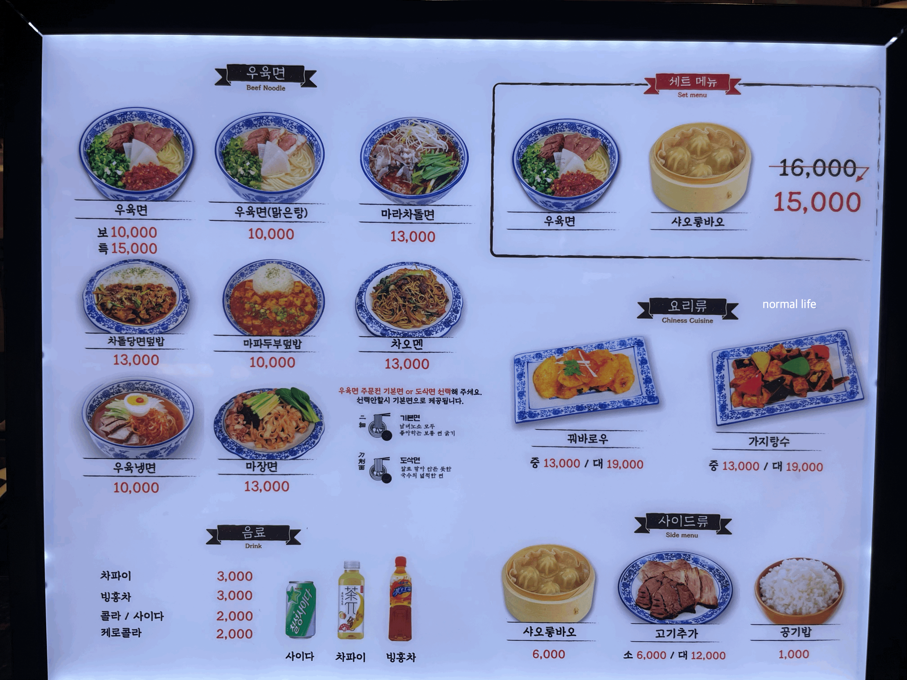 우육면과 육즙 가득한 샤오롱바오를 함께 맛볼 수 있는 #세트메뉴 15,000원 #우육면 10,000원 #마라차돌면13,000원 #차돌당면덮밥 13,000원 #마파두부덮밥 10,000원 #차오멘 13,000원 #우육냉면 10,000원 #마장면 13,000원 #꿔바로우 중 13,000원 대 19,000원 #가지탕수 중 13,000원 대 19,000원이다. 우육면은 기본면과 도삭면 중 선택이 가능하다.