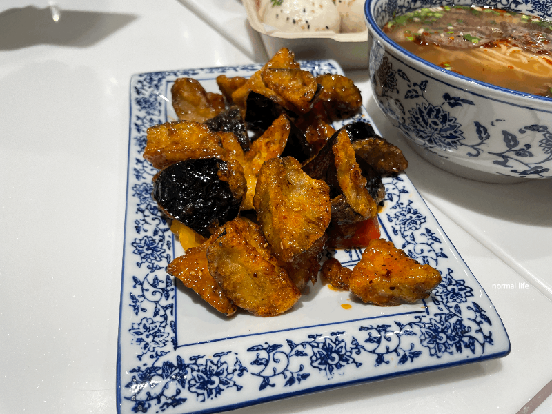 가지를 싫어하는 사람은 있어도 맛있게 맛볼 수 있는 샤오바오우육면의 가지튀김이다. 갓 튀겨낸 가지튀김을 중화풍 칠리소스로 볶아낸 가지탕수는 식감과 소스맛이 매력적이다.