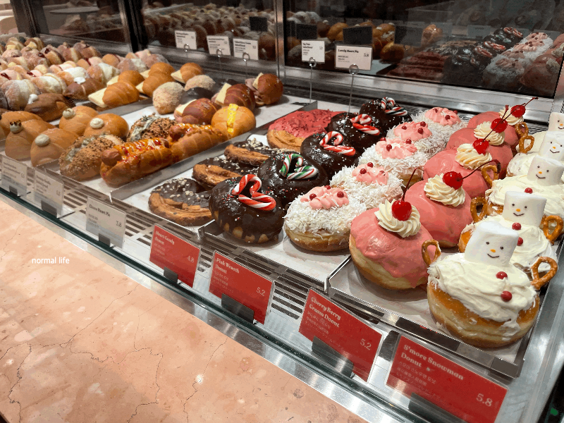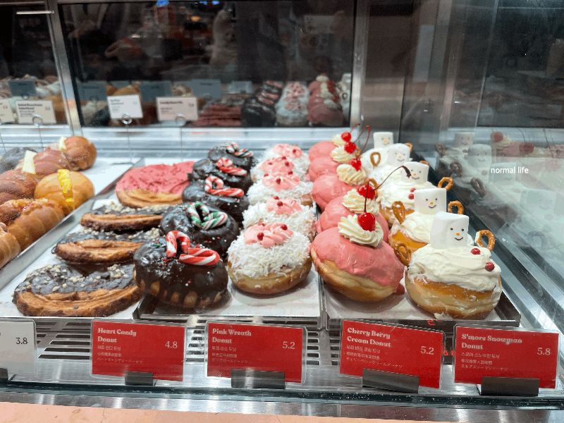 크리스마스 시즌 한정도넛 4종을 만날 수 있었다. #스모어 스노우맨 도넛 5,800원 #체리베리크림도넛 5,200원 #핑크리스도넛 5,200원 #하트캔디도넛 4,800원이다.