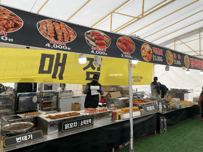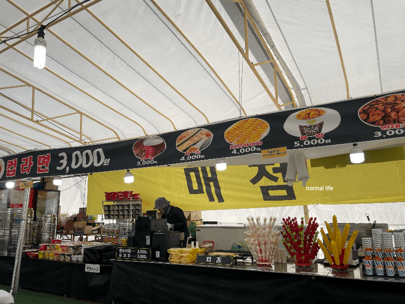 컵라면 3,000원 원두커피 3,000원 유자차 3,000원 구운 치즈 4,000원 회오리감자 4,000원 콜팝 5,000원 번데기 3,000원 소떡소떡 4,000원 핫도그 3,000원 떡볶이 5,000원 어묵 5,000원 등 다양한 먹거리가 매점에서 판매 중이었다.