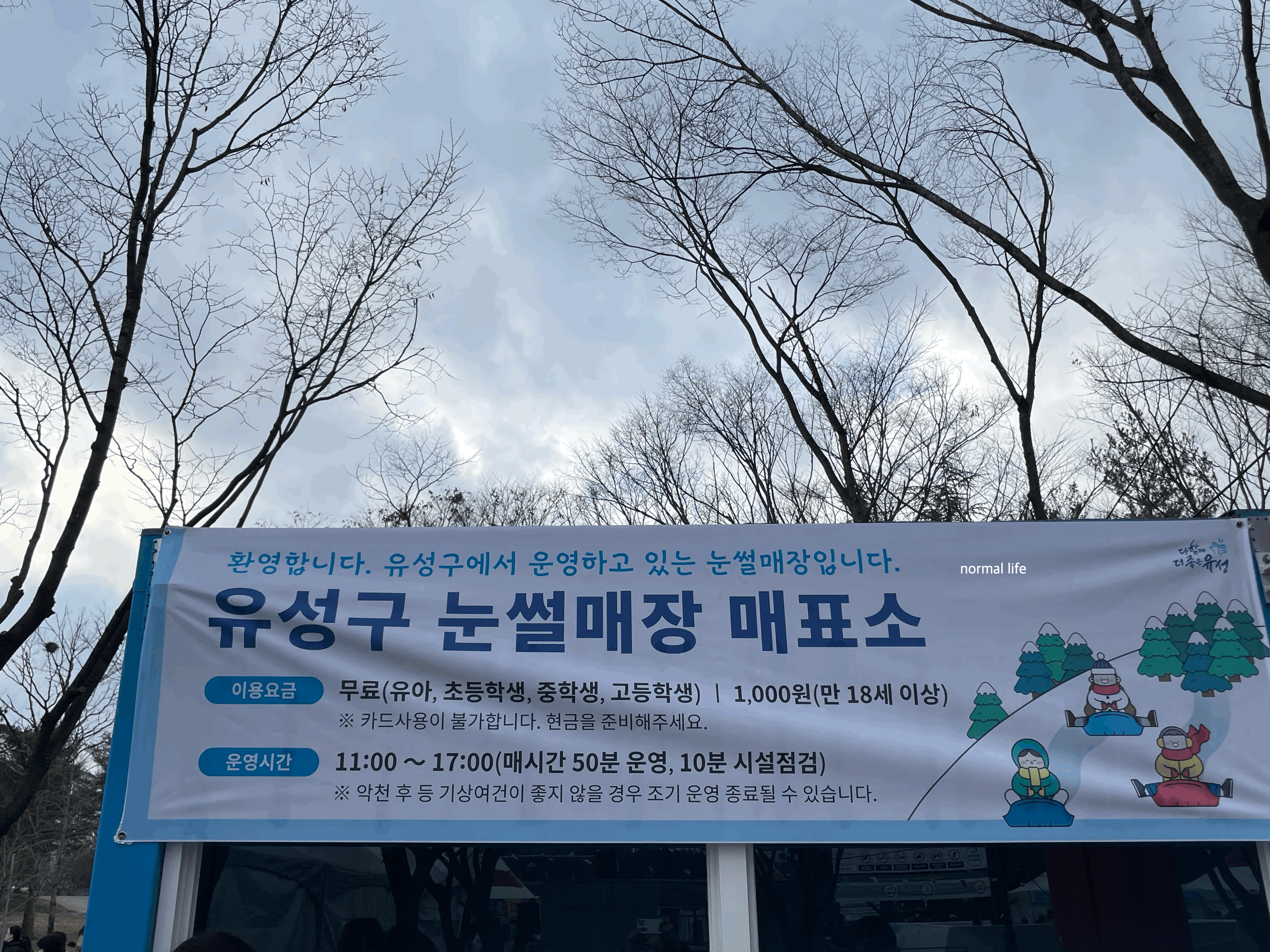 2024 유성구 어린이 눈썰매장 입장료는 만 3세 이상부터 이용이 가능하고 유아, 초등학생, 중학생, 고등학생은 무료로 입장이 가능하다. 만 18세 이상은 1,000원의 이용료가 있고 카드사용은 불가하니 현금을 준비해야 한다.