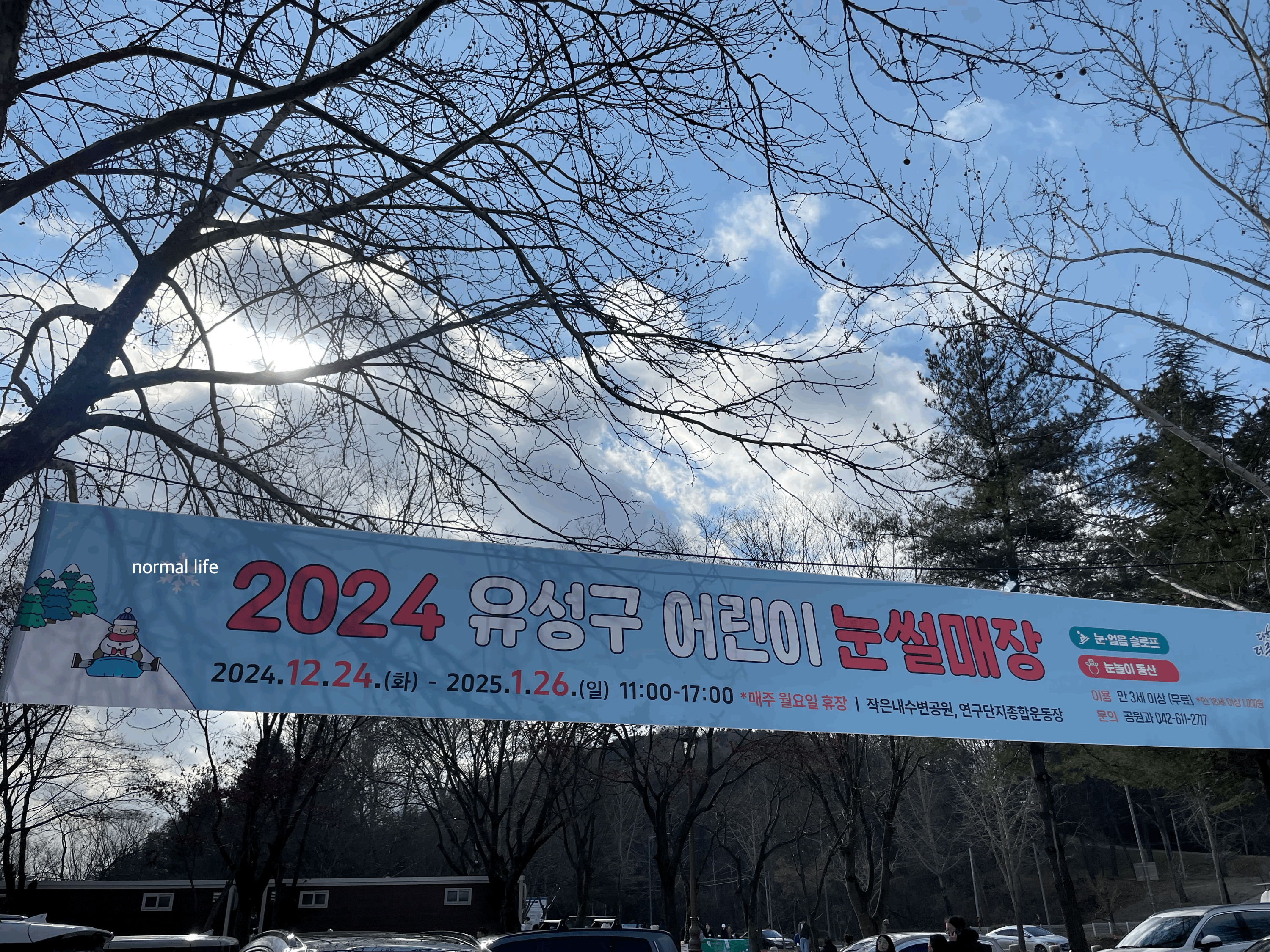 대전시 유성구는 신성동, 상대동 2곳에 2024년 12월 24일 어린이 눈썰매장을 개장하였다. 5세 딸아이와 눈썰매를 즐기기에 비교적 사람이 적은 신성동 눈썰매장을 방문하였다. 유성구 신성동 연구단지종합운동장 내에 위치하고 있으며 11시 30분쯤 도착하였는데 주차장이 이미 만차여서 가까스로 연구단지종합운동장 내에 주차를 할 수 있었다.
