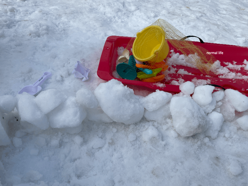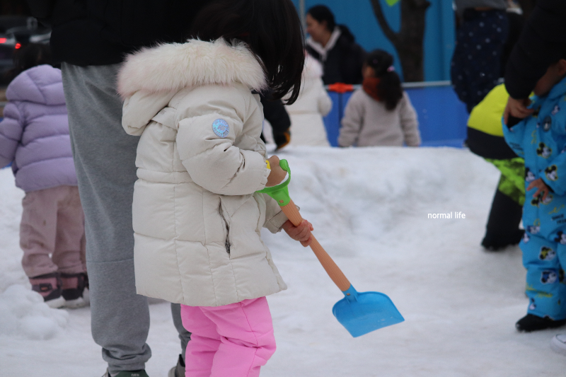 집에서 준비해 간 썰매와 모래놀이 장난감이다. 썰매는 무료로 대여가 가능하고 저 연령대 어린이와 2024 유성구 어린이 눈썰매장을 방문한다면 모래놀이 장난감을 꼭 추천하고 싶다. 5세 딸아이는 눈썰매보다는 눈으로 성과 집을 만드는 눈놀이를 더욱 좋아했다.