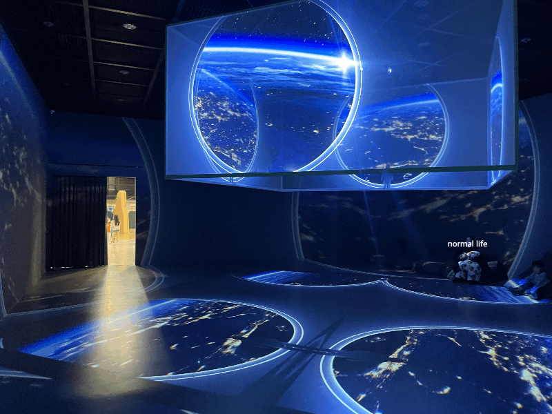천장에 매달린 스크린 구조물을 통해 공감각적으로 구성된 미디어 아트 공간은 우주를 향해 떠나는 상상의 여행을 체험할 수 있는 공간이다. 어두운 공간에서 빛과 소리를 이용한 전시이다 보니 5세 딸아이는 무서워해서 잠시만 머물 수 있었다.