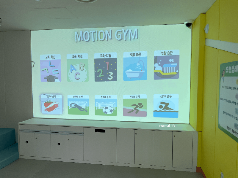 어린이의 움직임에 반응하는 모션플래시이다. 움직이는 손가락 모양으로 콘텐츠를 선택 후 손과 발을 이용하여 스크린에 나오는 미션을 진행하면 된다.