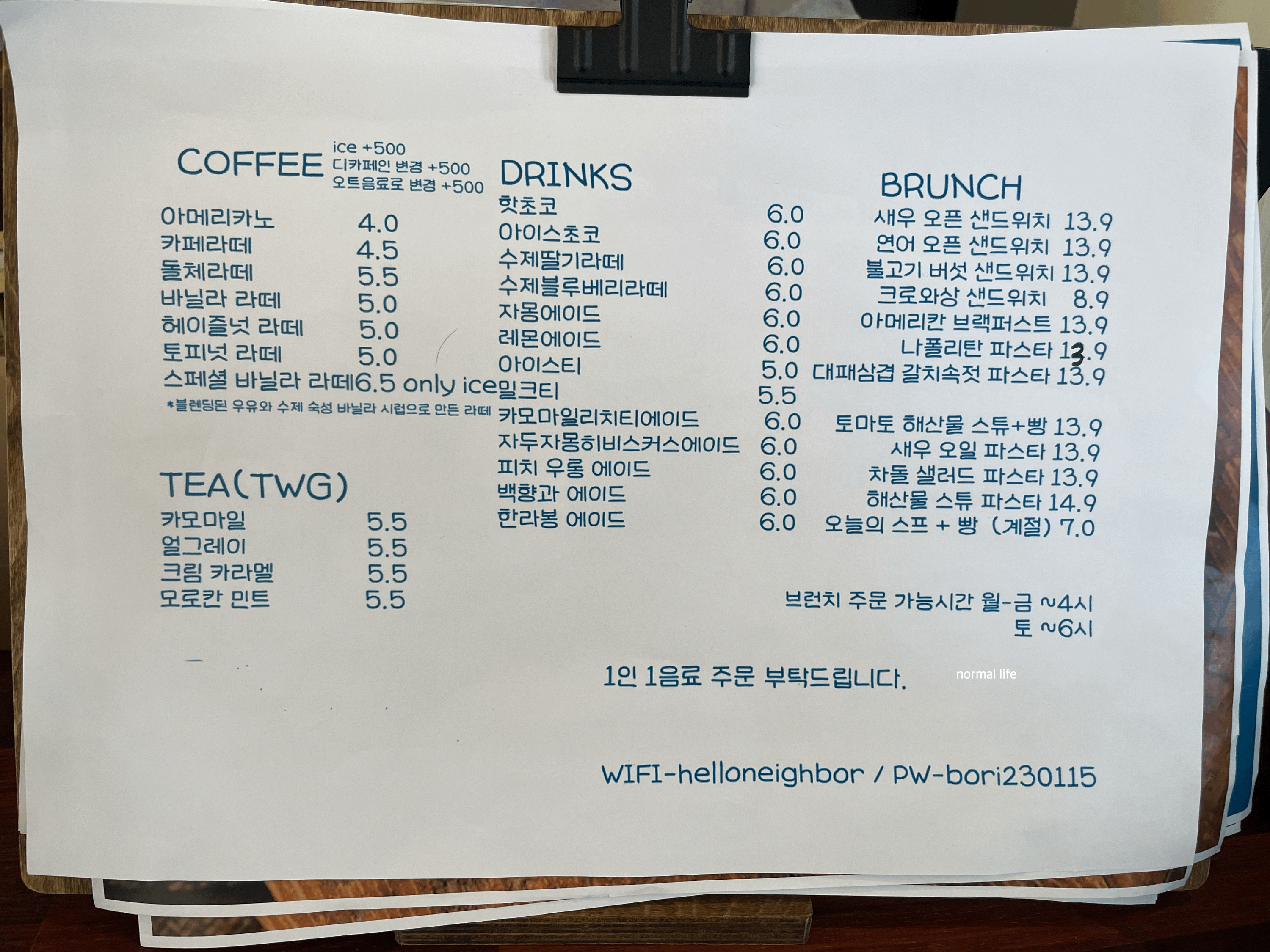 헬로우네이버는 평일 오전 10시부터 오후 8시까지 영업을 하며 매주 일요일은 휴무이다. 음료는 커피류와 TWG티, 다양한 음료를 선택할 수 있으며 다양한 브런치메뉴도 함께 할 수 있다.