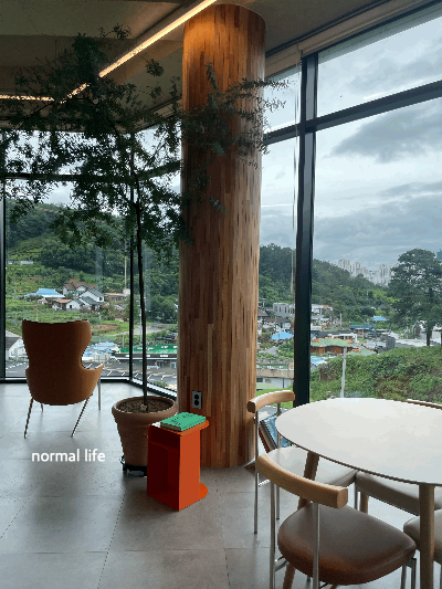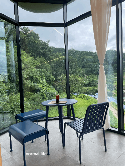 공간별로 다른 가구와 소품들을 배치하여 심플하고 세련된 분위기였다. 마음에 드는 소파나 테이블, 세종시 뷰와 푸르른 자연뷰 중 고를 수 있어 그날의 기분에 따라 좌석을 정해서 앉아서 즐기면 좋을 것 같다. 토요일 11쯤 방문하였을 때는 좌석이 여유가 있었는데 오후시간에 방문하였을 때에는 핫한 카페답게 마음에 드는 자리 잡기가 힘들었다. 평일 오픈시간 10시에 방문하면 여유롭고 한적하게 즐기기에 너무도 좋다.