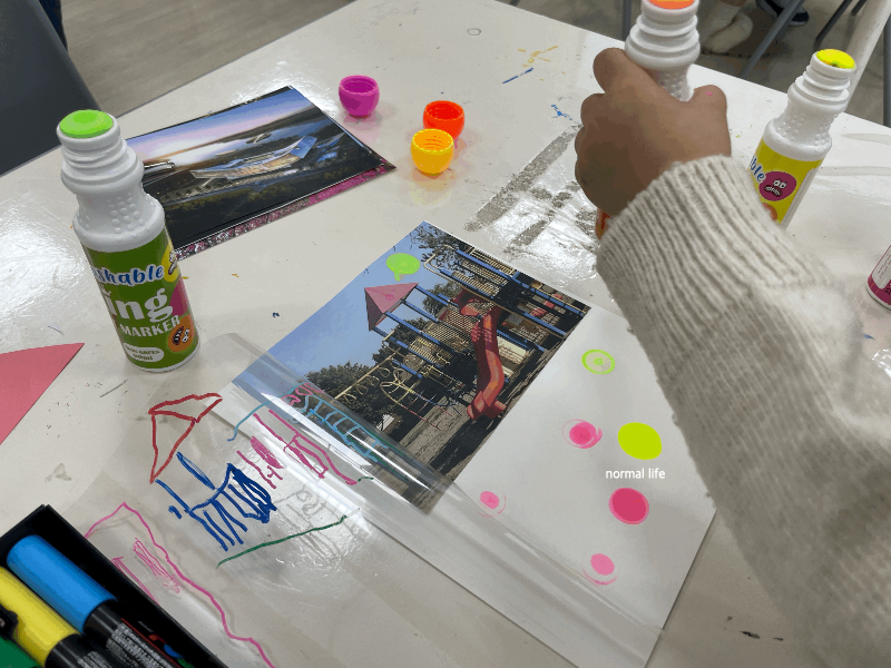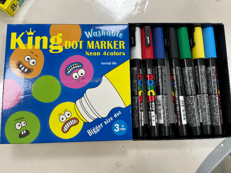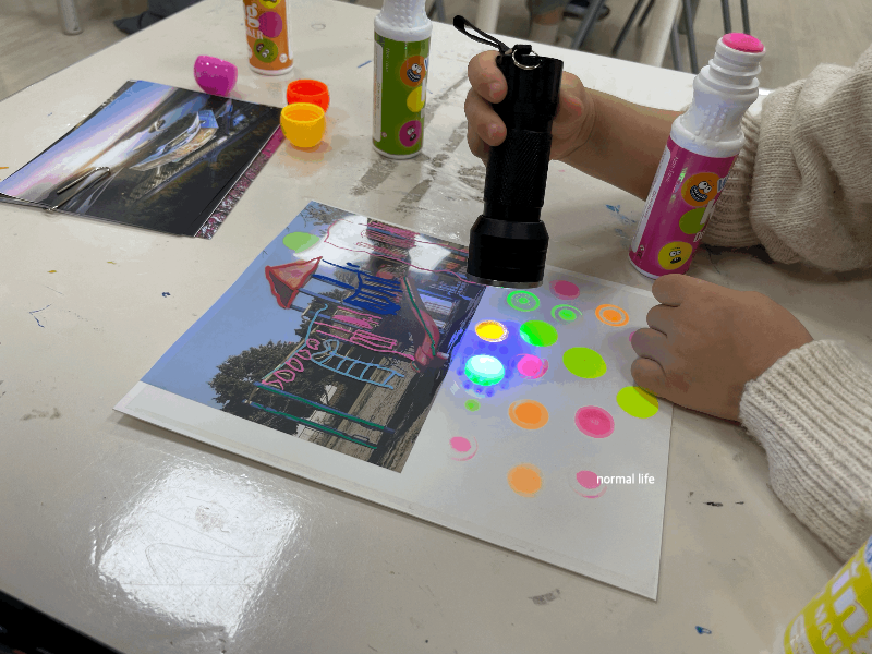 동동동네 여행가 교육프로그램동안 미술재료로 제공되는 형광 도트 물감과 마카팬이다. 점, 선, 면, 도형, 빛, 색 등을 자유롭게 표현할 수 있다.