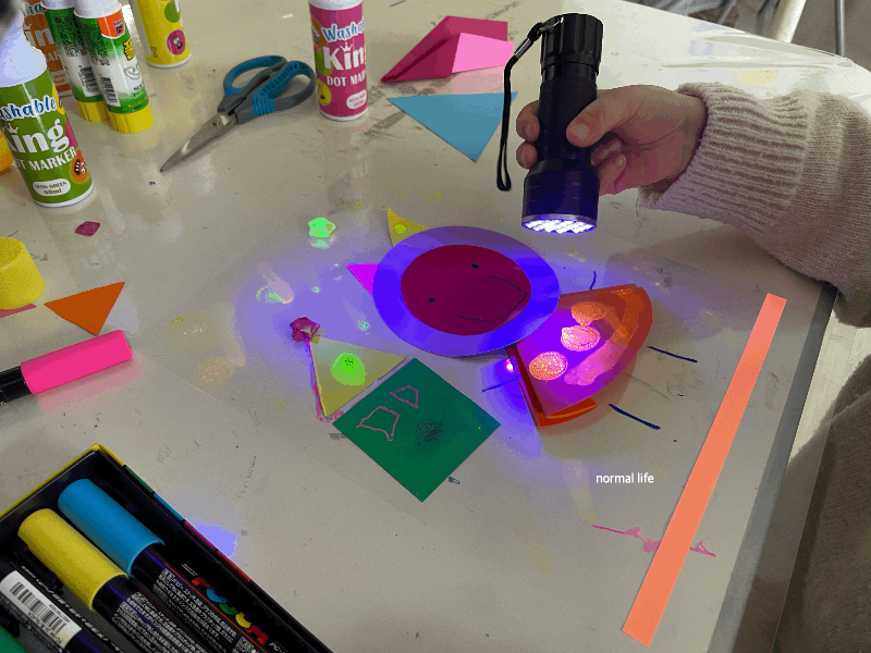 형광 도트 물감으로 표현한 도시의 빛을 UV랜턴으로 반짝반짝 빛나는 놀이터를 만날 수 있었다.