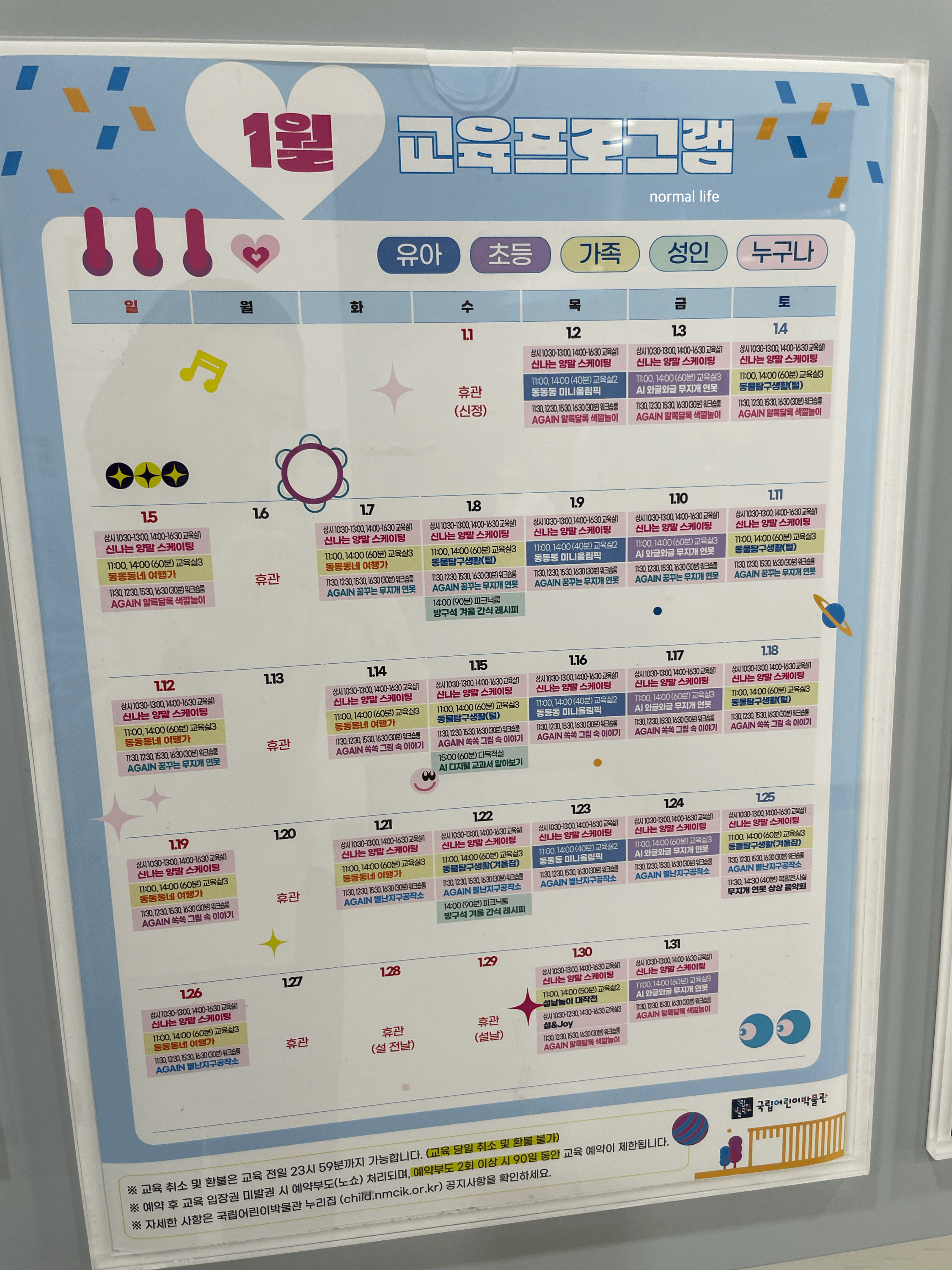 국립어린이박물관은 어린이, 가족, 단체 모두를 위한 다양한 교육프로그램들이 있다. 겨울을 맞이하여 2025년 1월 현재는 신나는 양말 스케이팅, 동동동 미니 올림픽 등 특색 있는 교육들을 체험할 수 있다.