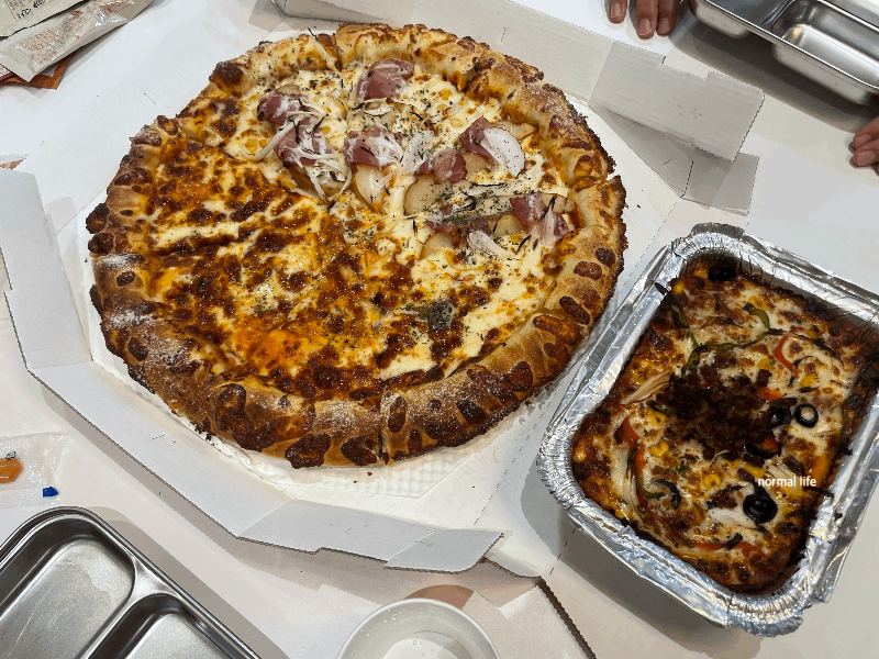 두가지 피자를 함께 즐길 수 있는 반반피자를 주문하였다. 아이가 좋아하는 치즈피자와 엄마가 좋아하는 베이컨 포테이토에 통치즈 크러스트 엣지를 추가하였다. 5년간 간수를 뺀 천일염과 100% 천연 생우유로 숙성한 소금우유도우로 쫄깃하고 바삭함이 매력적인 노모어피자이다.