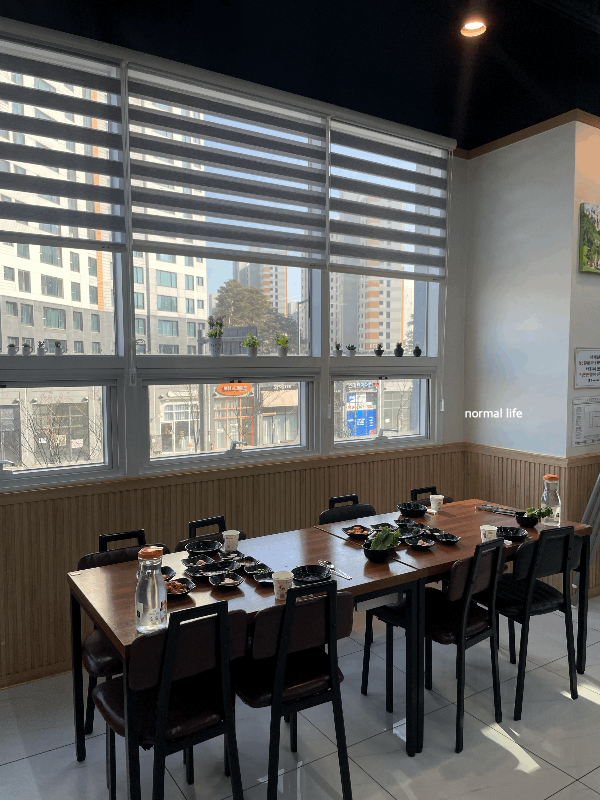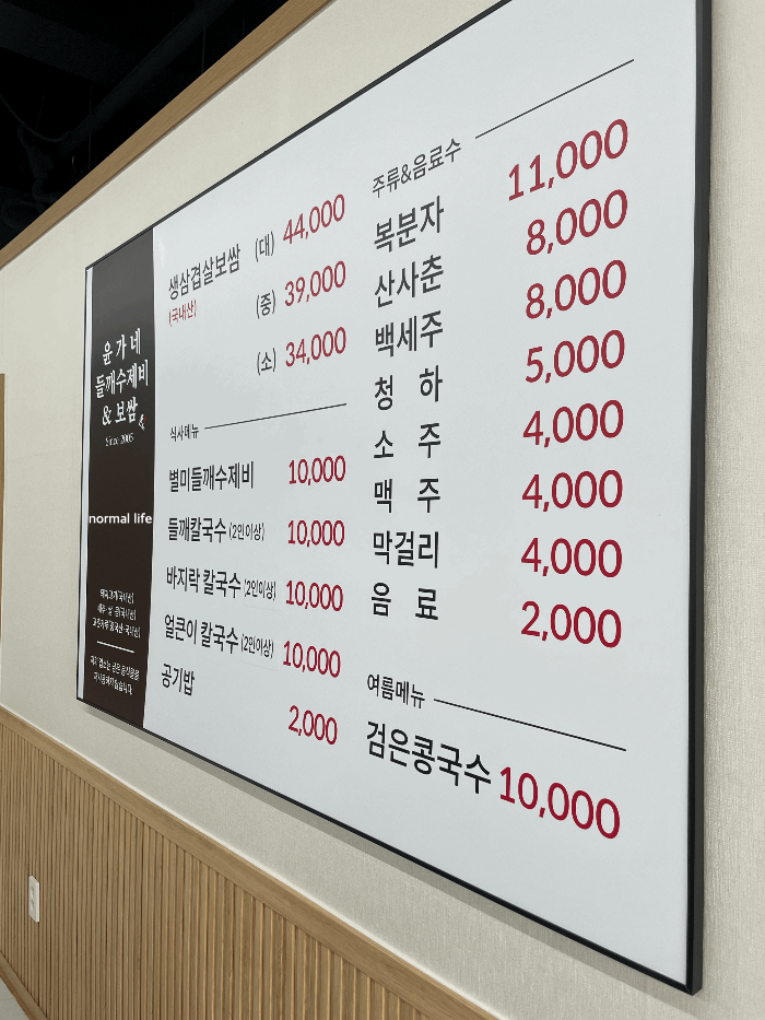 2024년 확장 이전하여 윤가네들깨수제비&보쌈의 내부는 깔끔하고 넓었다. 기존 봉암리의 편안하고 따뜻한 온돌좌식과는 다르게 테이블에서 식사를 할 수 있었다. 유아테이블도 준비되어 있어 유아와 함께 방문했을 때에는 요청할 수 있다.