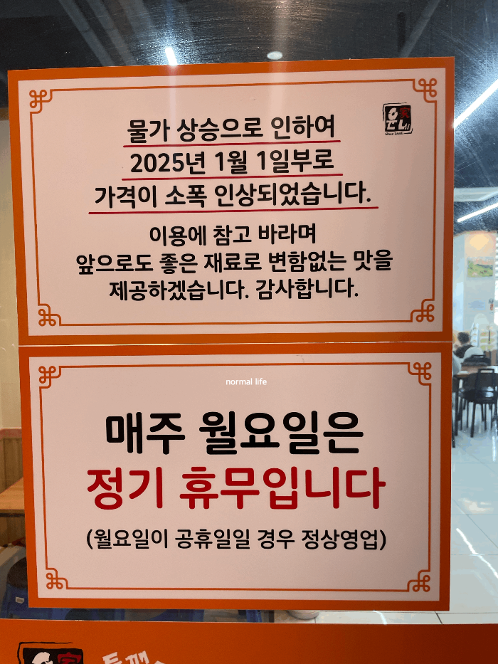 원재료값 상승으로 2025년 1월 1일부터 가격이 소폭 상승되었다는 안내문이 붙어있다.