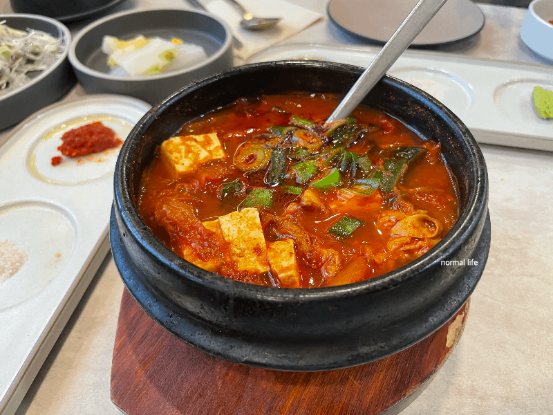 정숙성 세종점은 참숯불, 그릴링, 상차림, 찌개 서비스를 위해 첫 주문은 3인분 이상 가능하다고 한다. 두툼한 돼지고기가 들어간 얼큰한 김치찌개가 서비스로 제공된다.