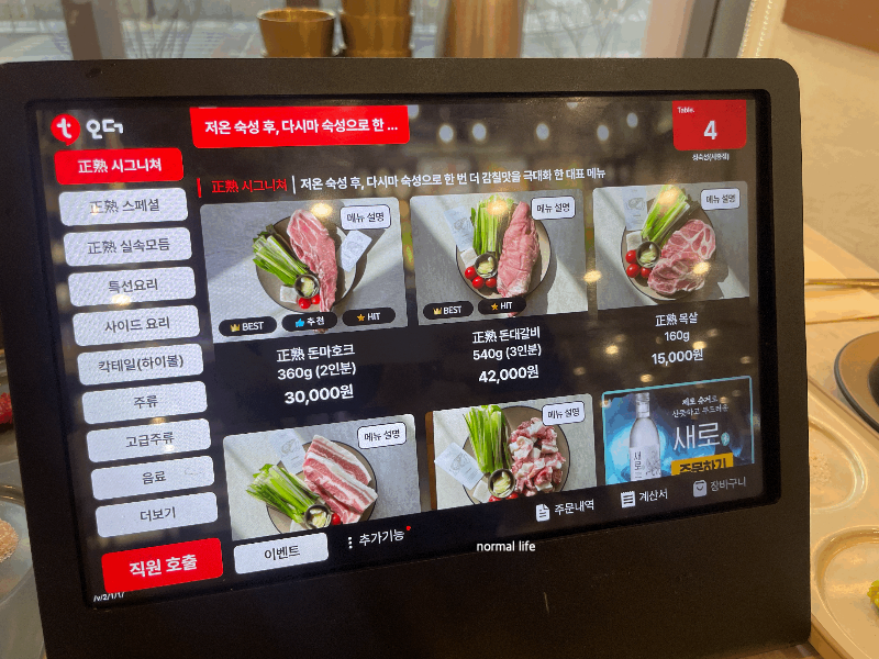 우리는 토요일 오후 5시 30분 예약을 하고 정숙한 세종점을 방문하였고 예약 시간에 맞춰 테이블 세팅이 되어있었다. 정숙한 세종점은 테이블오더이고 식사 후 계산하는 시스템이다.