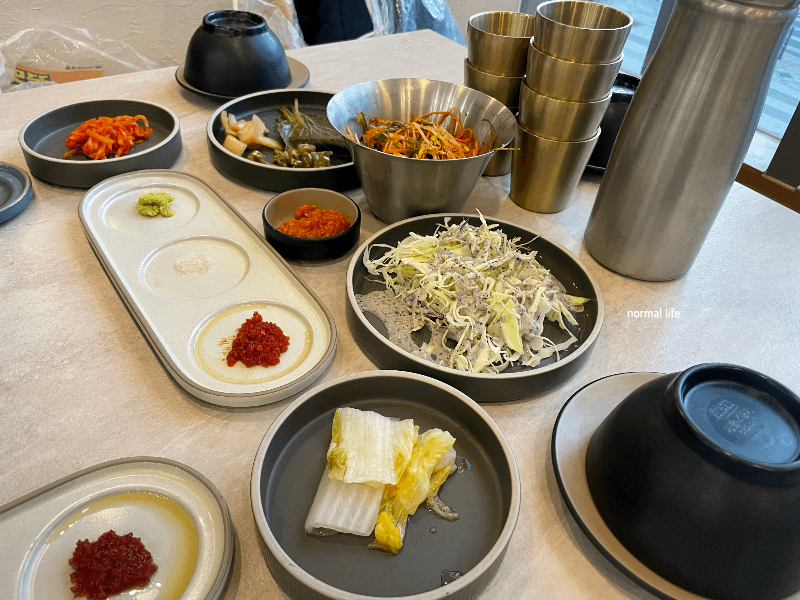 신선한 샐러드, 파채, 장아찌, 백김치, 쌈야채, 소스 등이 상차림으로 준비되어 있고 셀프코너에서 쌈야채와 반찬을 리필할 수 있다.