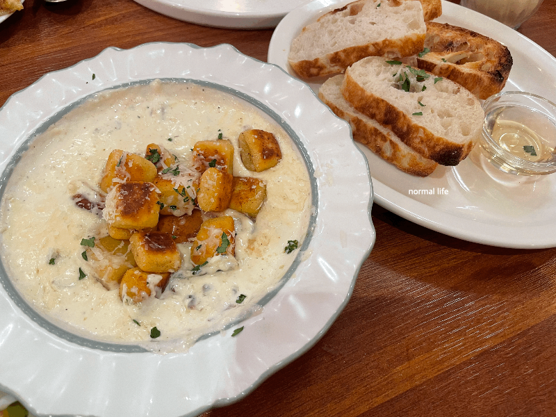 매장에서 직접 반죽한 뇨끼와 고소한 크림치즈가 가득한 홈메이드 양송이 크림뇨끼이다. 바삭하면서 쫄깃한 뇨끼가 매력적이며 고소하면서 녹진한 크림소스와 함께 곁들일 치아바타도 추가주문하였다.