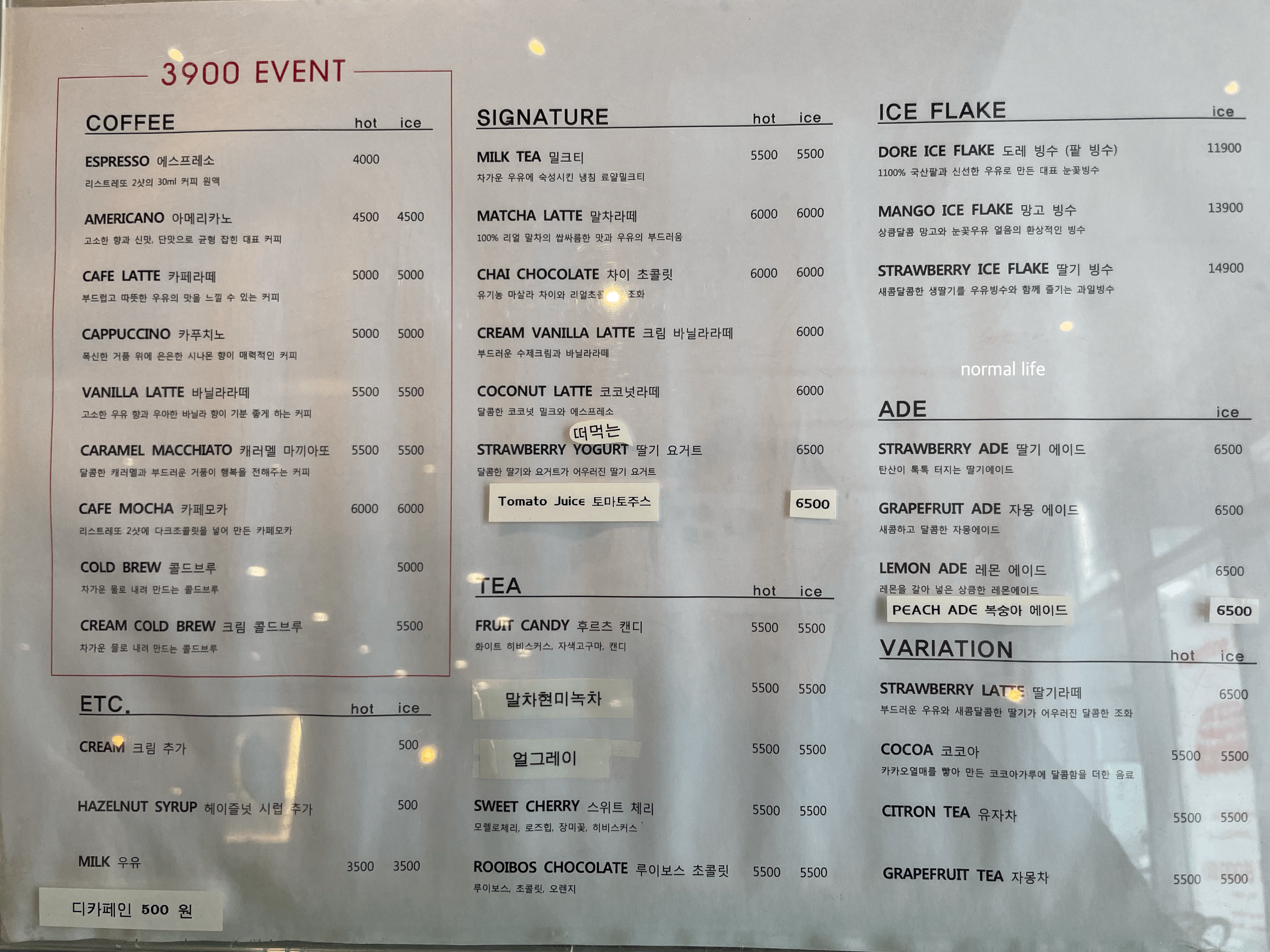 매장에서 만든 신선하고 달콤한 케이크와 함께 즐길 수 있는 다양한 음료들을 선택할 수 있다. 고마워케이크는 스페셜티 원두를 사용한 모든 커피를 3,900원에 즐길 수 있는 이벤트를 진행 중이다. 디카페인은 500원을 추가금액이 있다. 고마워케이크 시그니처 음료는 #밀크티 5,500원 #말차라떼 6,000원 #차이 초콜릿 6,000원 #크림바닐라라떼 6,000원 #코코넛라떼 6,000원 #떠먹는 딸기요거트 6,500원 #생과일 토마토주스 6,500원이다.