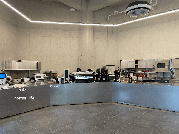 입구로 들어서면 스테인레스 소재로 꾸며진 주방 공간이 유니크하다. 흔치 않은 스테인리스로 꾸며진 주방이 멋스럽고 모던한 건축물과 잘 어울려 공간이 굉장히 넓어 보였다. 1층에는 테이블이 없고 주문과 베이커리실만 있어 주문을 하고 2층으로 올라가서 티타임을 즐기면 된다.