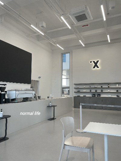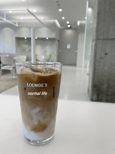 라운지엑스에 들어서면 제일 먼저 벽의 한 면을 차지한 전면스크린이 눈에 띈다. 미래로 향하는 감각을 느낄 수 있는 공간의 의미라 #라운지엑스라고 한다. 카페 1층은 그런 미래의 카페를 경험할 수 있는 라운지 공간이라면 2층은 심플하고 세련된 공간이었다. 빛이 가득 들어오는 통창으로 나란히 앉을 수 있는 좌석도 마련되어 있는데 개인적으로 좋아하는 공간이다. 세련된 화이트로 꾸며져 있지만 자칫 삭막할 수 있는 공간들을 식물들로 포인트주어 활기를 불어주는 느낌이었다.