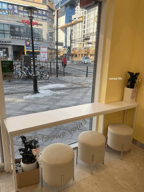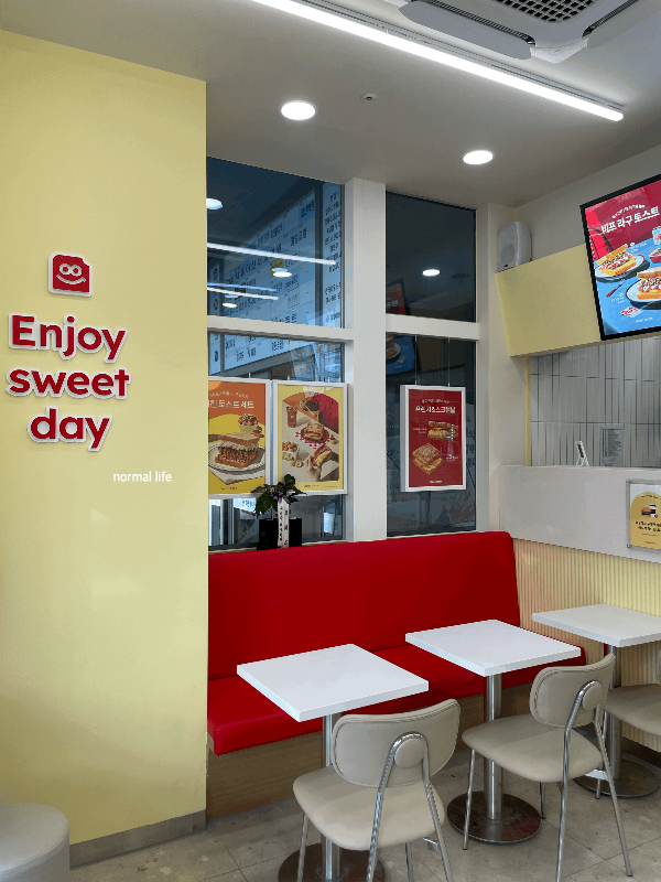 따뜻한 버터컬러와 레드 컬러 조화가 따듯하면서 경쾌한 매장 안이다. 달콤하면서 든든한 토스트를 맛볼 수 있는 공간들이 매장 안에 마련되어 있다.