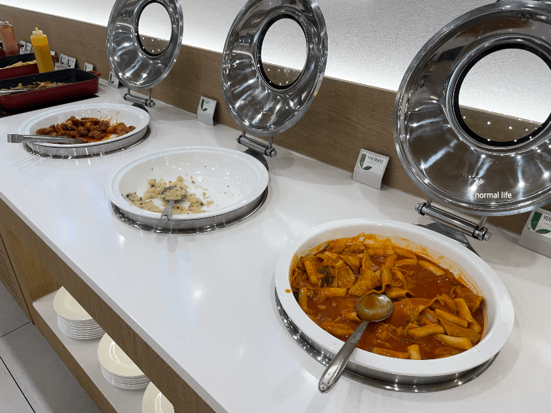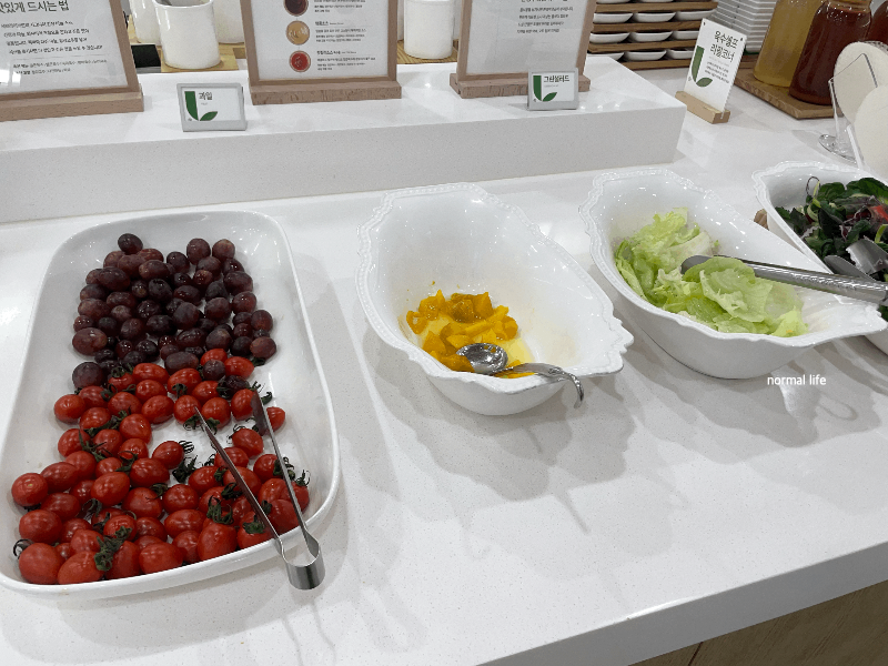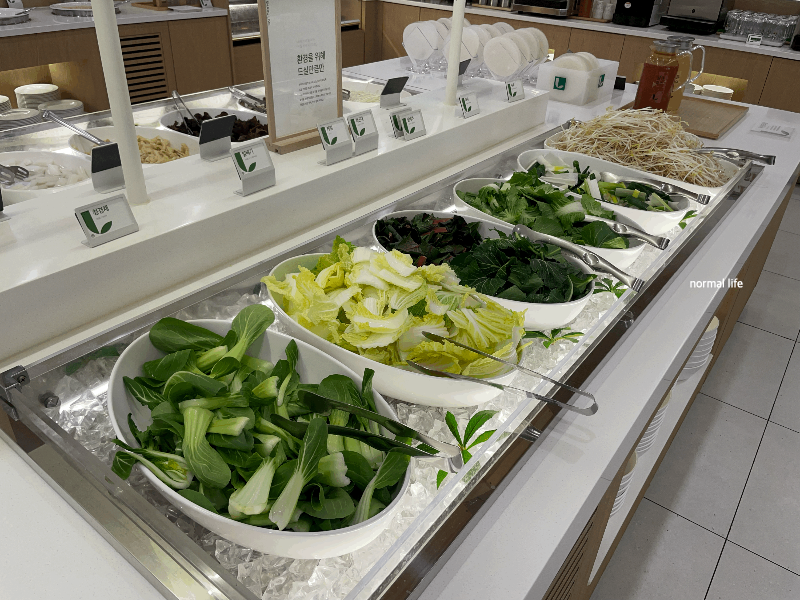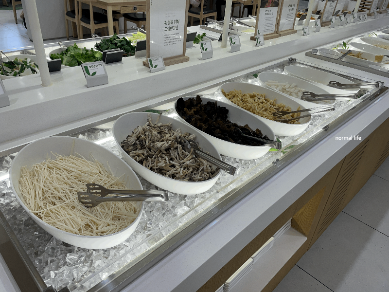 샐러드바에 비빔녹두당면, 묵무침, 냉파스타, 단호박샐러드, 고구마샐러드가 준비되어 있어 식전 입맛을 돋울 수 있다.