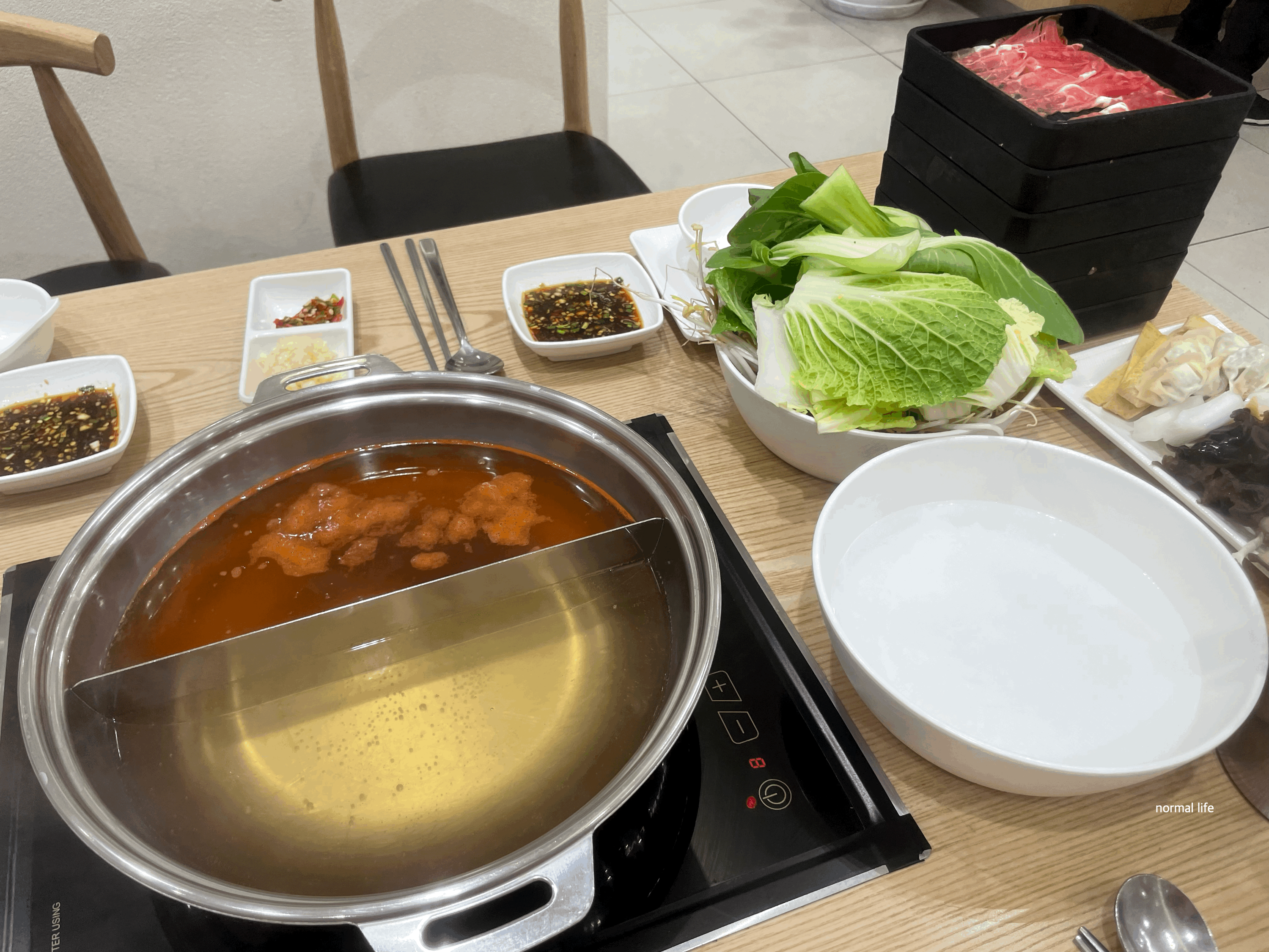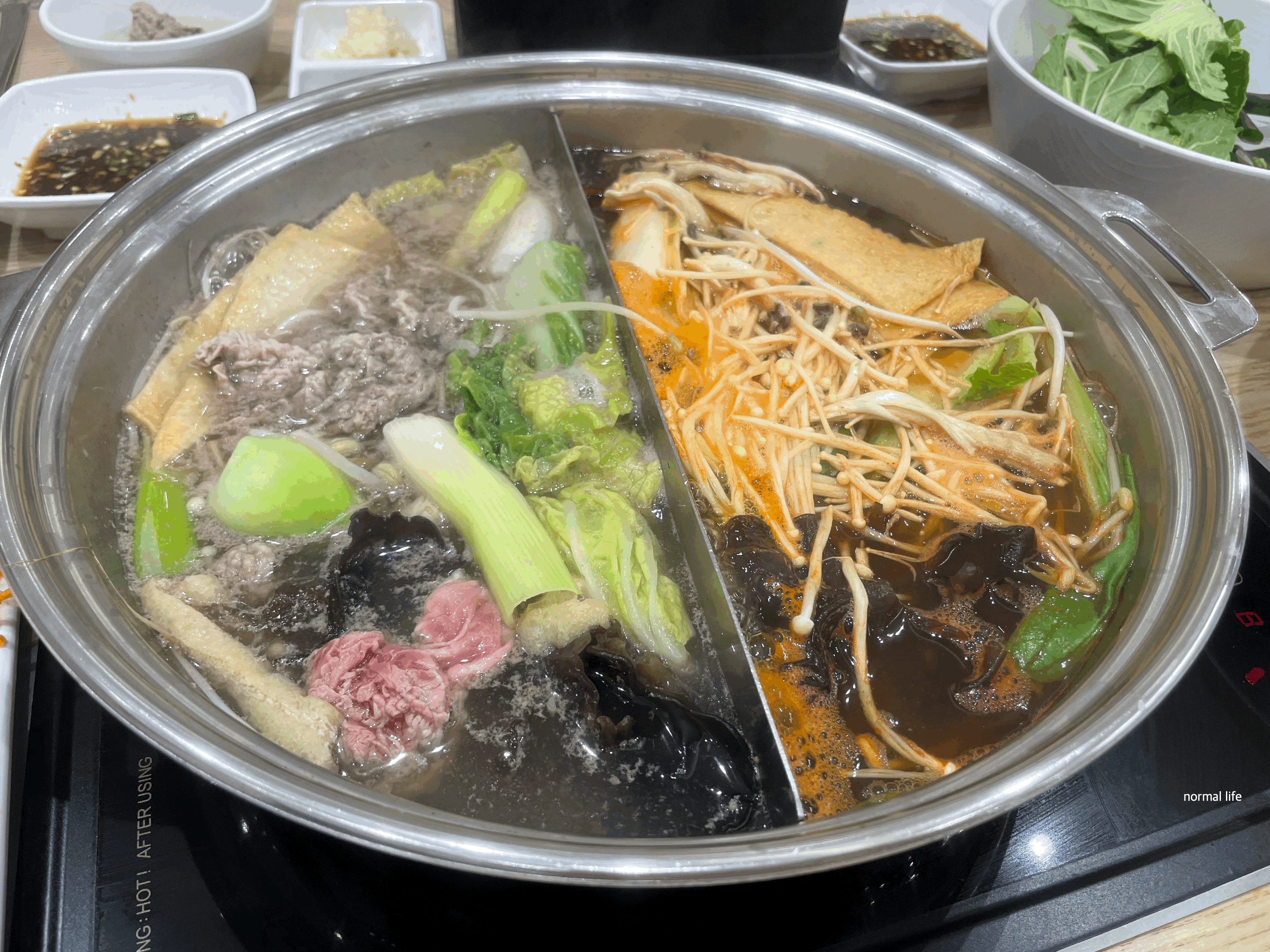 샤브라이브는 육수를 반반으로 선택이 가능하다. 우리는 오리지널 육수인 맑은 육수와 얼큰 육수를 선택하였다. 오리지널인 맑은 육수와 얼큰 육수 외에도 방아잎 육수, 능이 육수, 마라 육수를 선택할 수 있다.