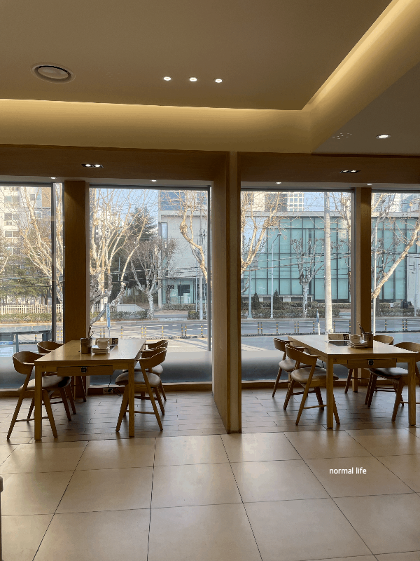 통창 너머로 보이는 북대구세무서 뷰의 샤브라이브 창가좌석이다. 매일 11시부터 22시까지 영업하며 브레이크타임 없이 무한리필 샤브샤브를 즐길 수 있다.